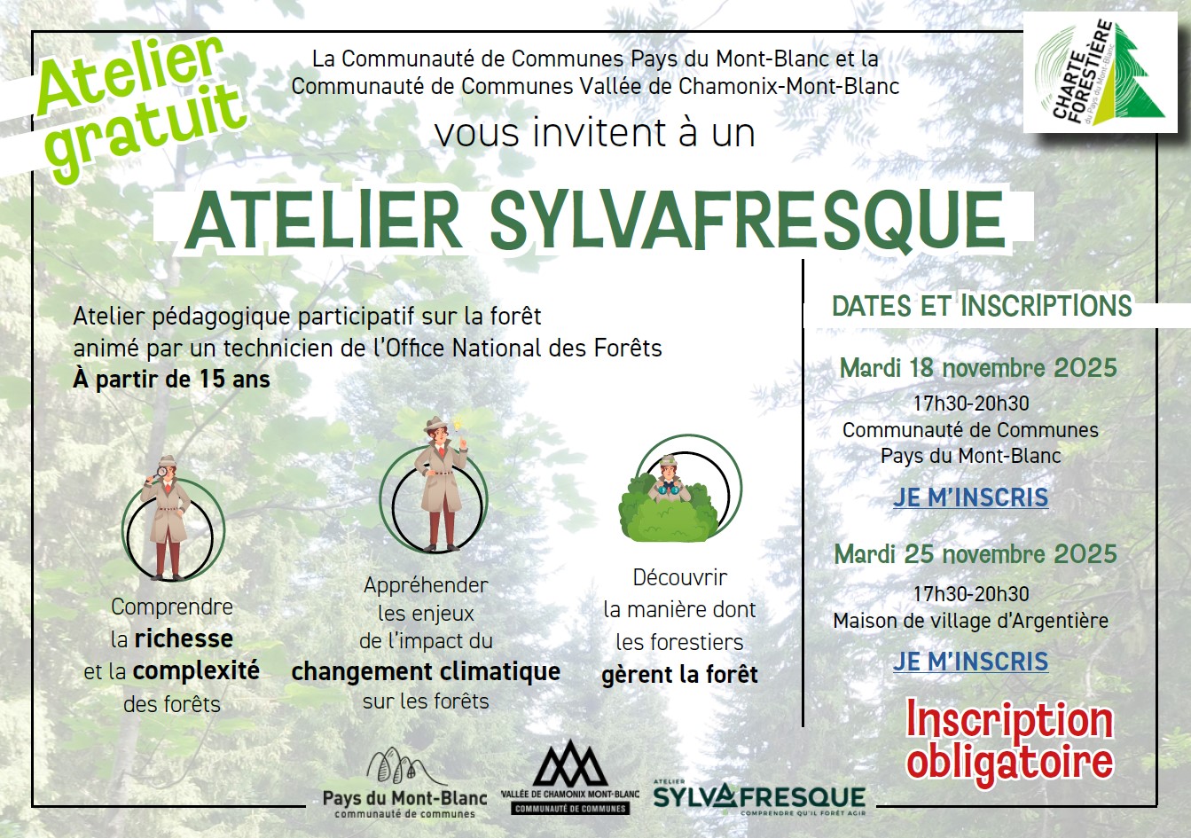 Dans le cadre de la Charte forestière du Pays du Mont-Blanc, la Communauté de Communes du Pays du Mont-Blanc et la Communautés de Communes de la Vallée de Chamonix Mont-Blanc proposent au grand public des ateliers de découverte de la forêt, sous la forme de fresque animées par un technicien de l’Office National des Forêts (ONF).