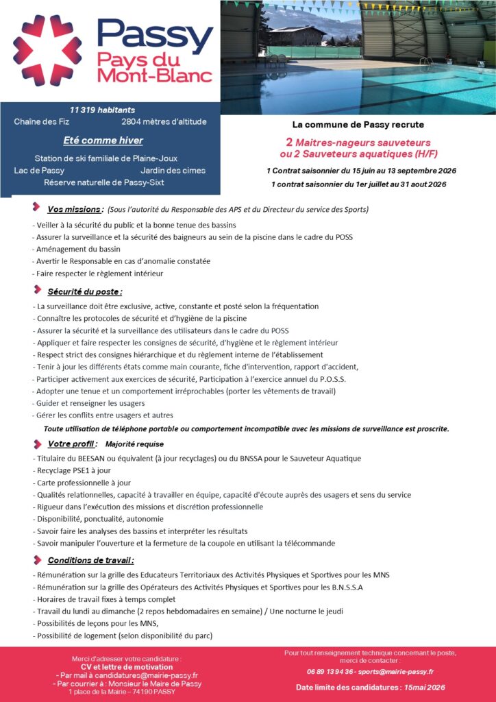 Service de rattachement : Sports Date limite de candidature : 15/05/2026 Lieu : Piscine municipale de PASSY Catégorie : Catégorie C Type de contrat : Emploi saisonnier
