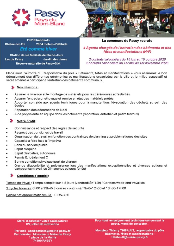 EMPLOIS SAISONNIERS – 4 Agents chargés de l’entretien des bâtiments et des fêtes et manifestations (H/F)