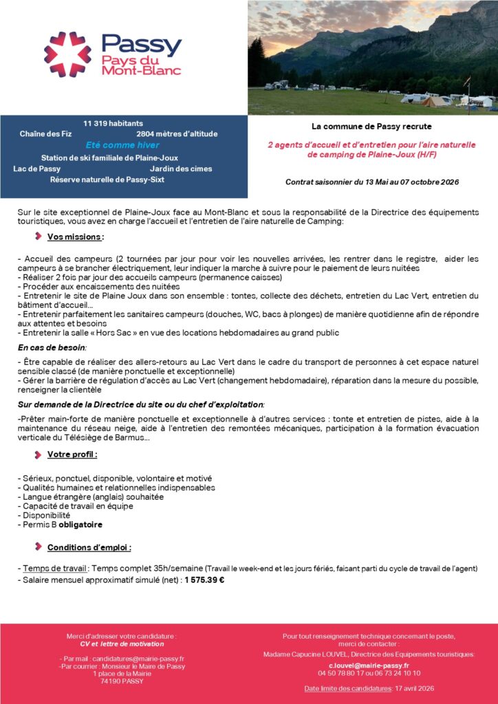 Service de rattachement : Tourisme Date limite de candidature : 17/04/2026 Date de prise de poste : 13/05/2026 Lieu : Plaine-Joux Catégorie : Catégorie C Type de contrat : Emploi saisonnier