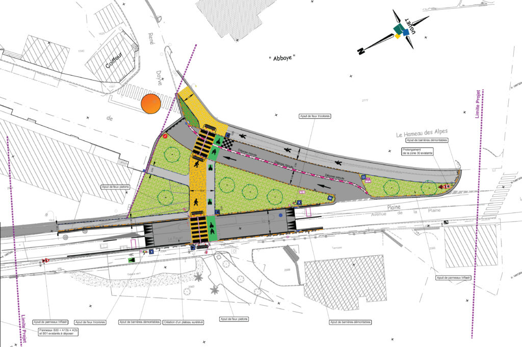 - Phase 3b (3 semaines) : finitions de la pose de revêtement et aménagement paysager. La circulation est coupée sur l’Avenue de Chamonix. La mise en place d’un feu tricolore provisoire de chantier sur l’Avenue de la Plaine est prévue.
